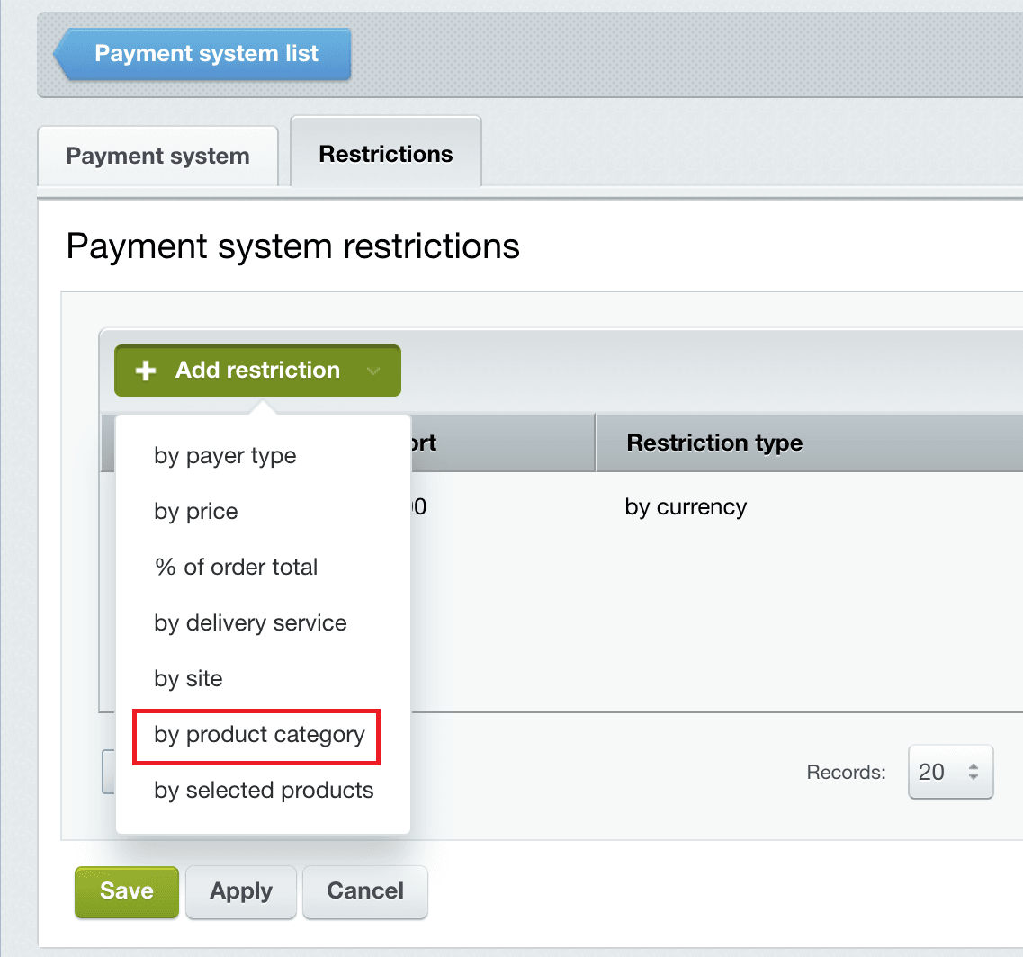 - Sign in to Webasyst administrative panel. Select "Store", and at the top right-hand corner click on Settings. In the side menu on the left, select Payment>Add payment option.