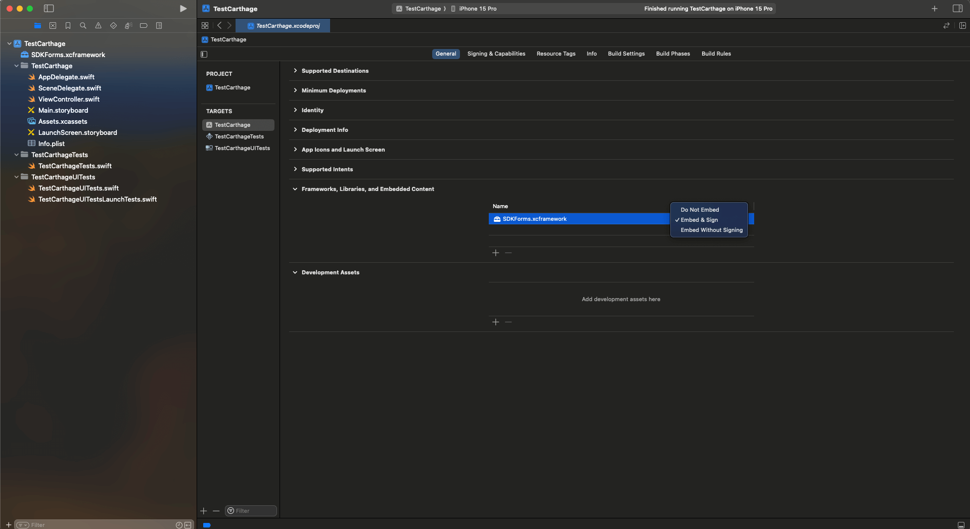 SDKCore.frameworkandSDKForms.framework, in the Embed column, changeDo not EmbedtoEmbed & Sign.