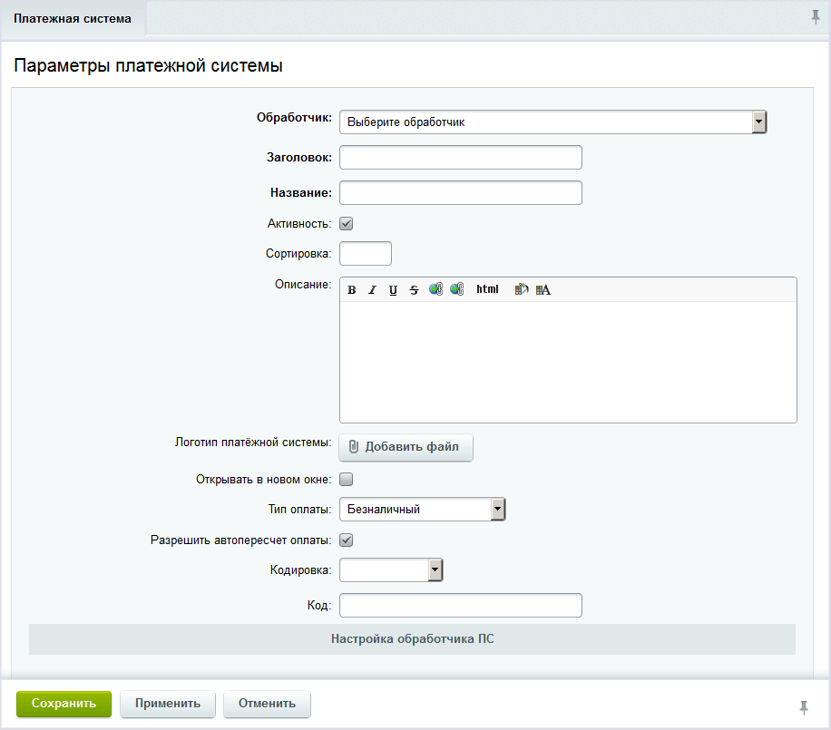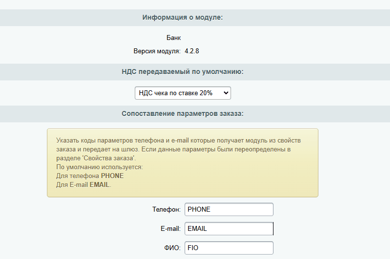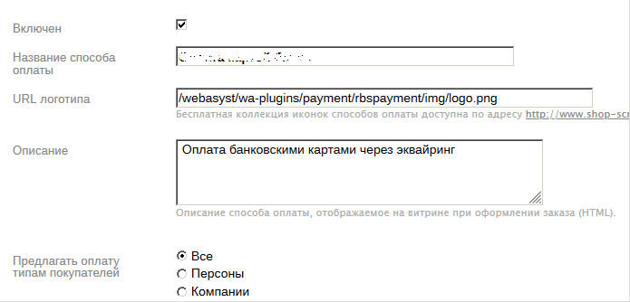 | Название способа оплаты | Укажите название способа оплаты или оставьте значение по умолчанию. |