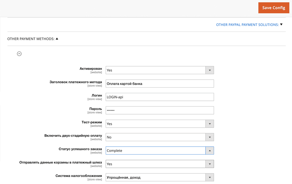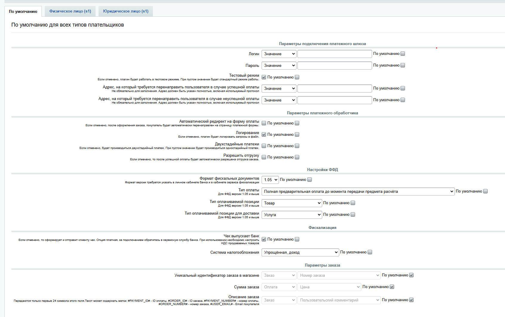 Настройки ниже относятся к налогообложению и корзине. Они могут отображаться или не отображаться в зависимости от глобальных настроек плагина в файле /wa-plugins/payment/paypayment/lib/config/include.php. Параметр, определяющий это, называется define('PAY_ENABLE_FISCALE_OPTIONS', true);. Значение по умолчанию — true, но его можно изменить на false, чтобы скрыть эти настройки.