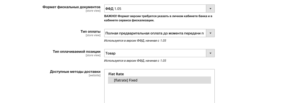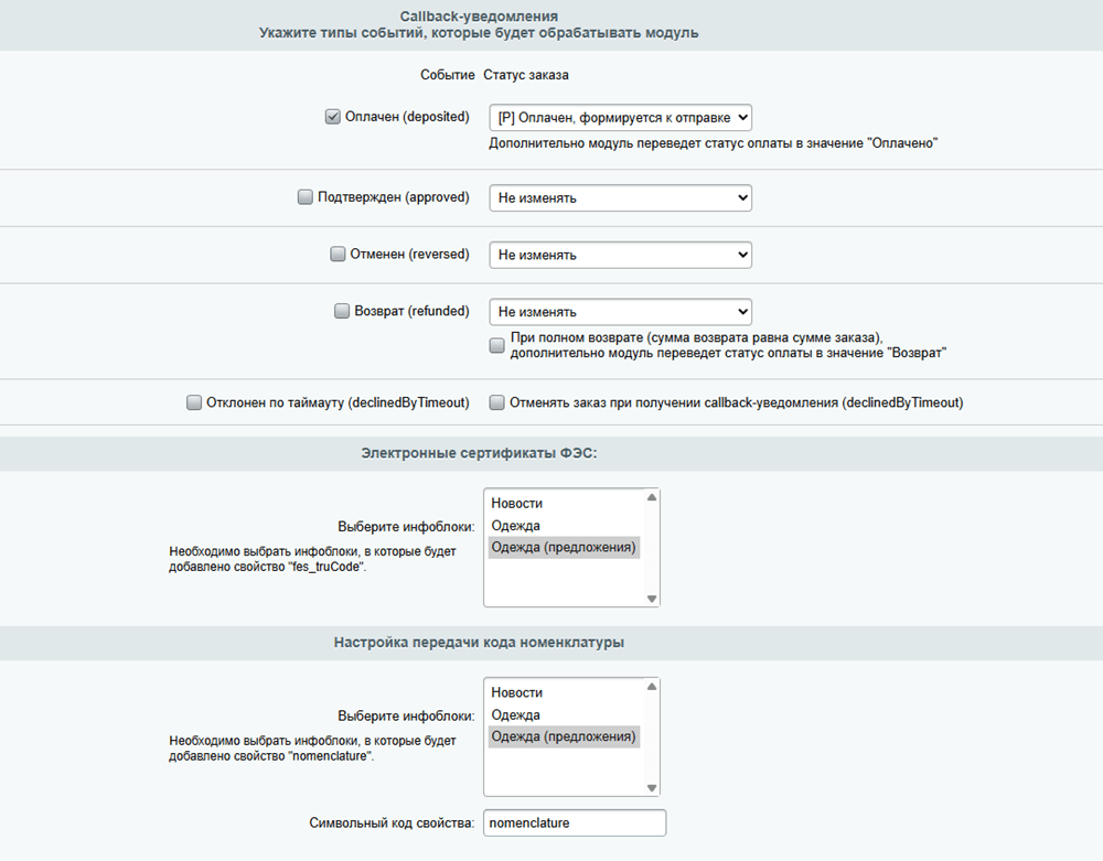 Значения для указанных настроек необходимо заполнить в соответствии с договором эквайринга и вашими бизнес процессами.
