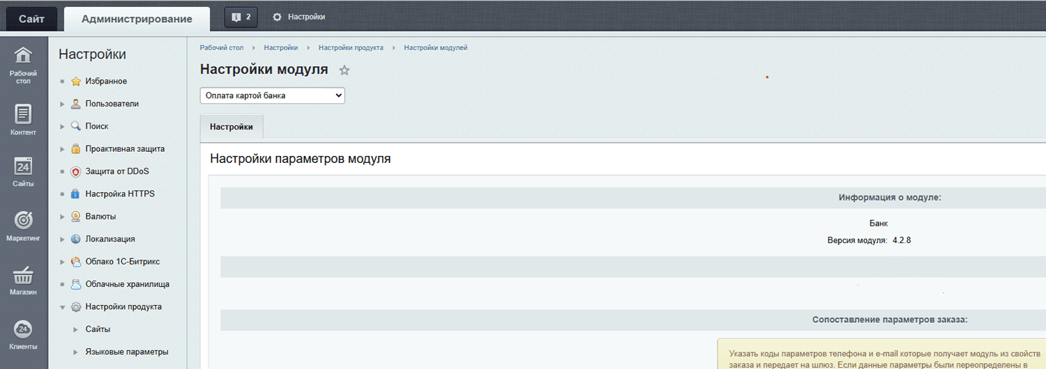 | Отправлять данные корзины покупателя на платежный шлюз | Позволяет выбрать, будет ли передаваться товарная корзина и будет ли сформирован товарный чек. Чтобы получить возможность использовать эту функциональность, обратитесь к представителю банка. Подробнее см. Онлайн-кассы. |