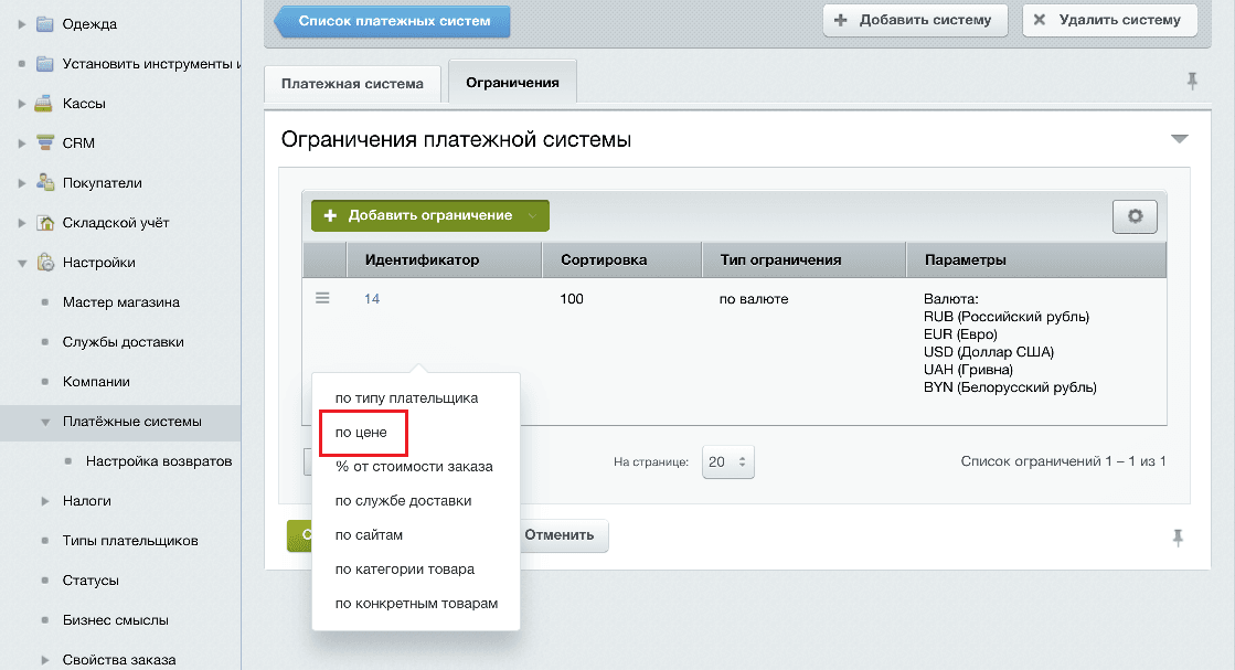 - Войдите в административную панель Webasyst. Выберите Магазин и в правом верхнем углу нажмите Настройки. В боковом меню слева выберите Оплата>Добавить способ оплаты.