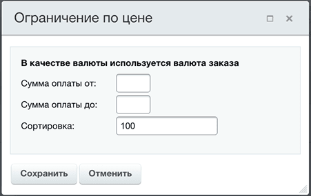 | Предлагать этот способ оплаты для выбранных типов доставки | Параметр, определяющий, для каких типов доставки будет доступен вариант оформления заказа, предоставляемый плагином. |