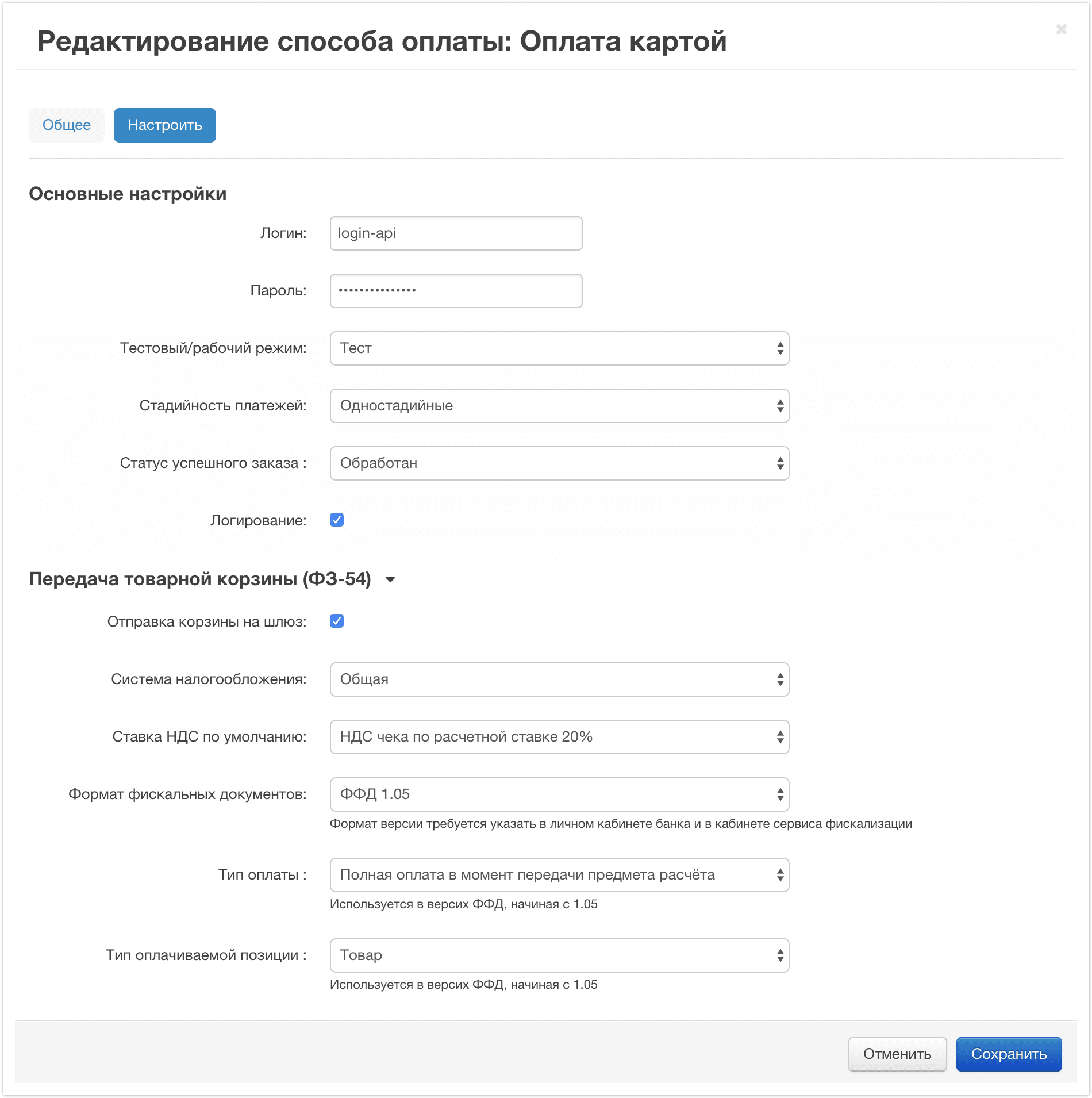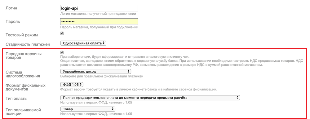 | Отправка корзины на шлюз | Позволяет выбрать, будет ли передаваться товарная корзина и будет ли сформирован товарный чек. Чтобы получить возможность использовать эту функциональность, обратитесь к представителю банка. Подробнее см. Онлайн-кассы. |