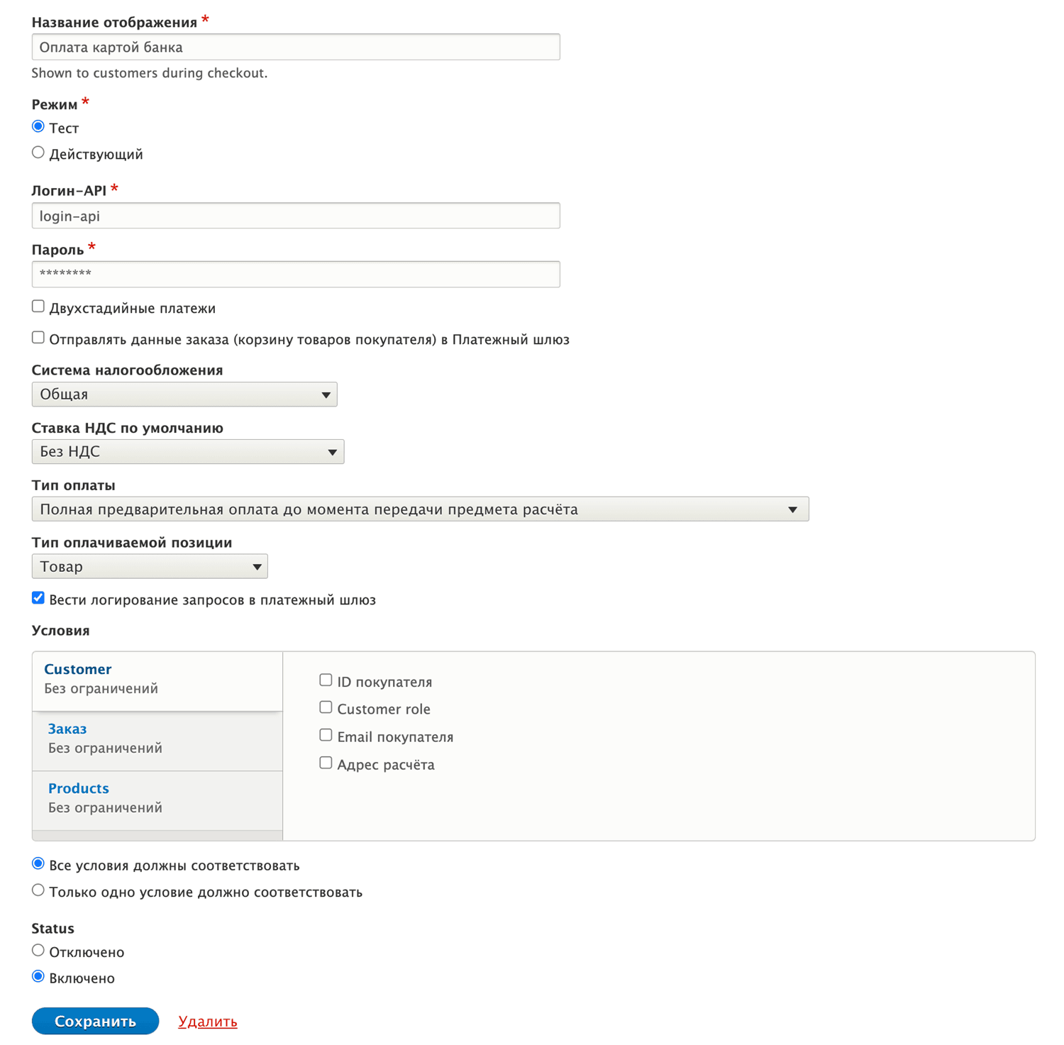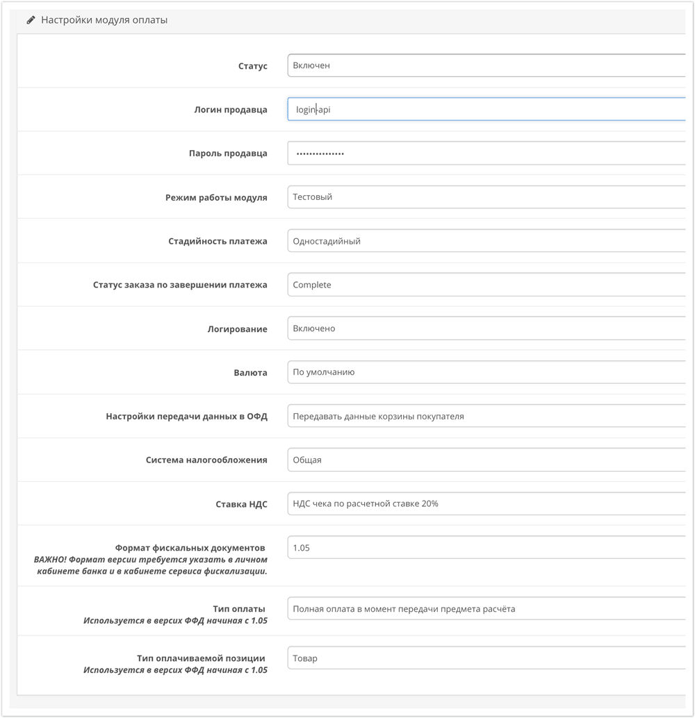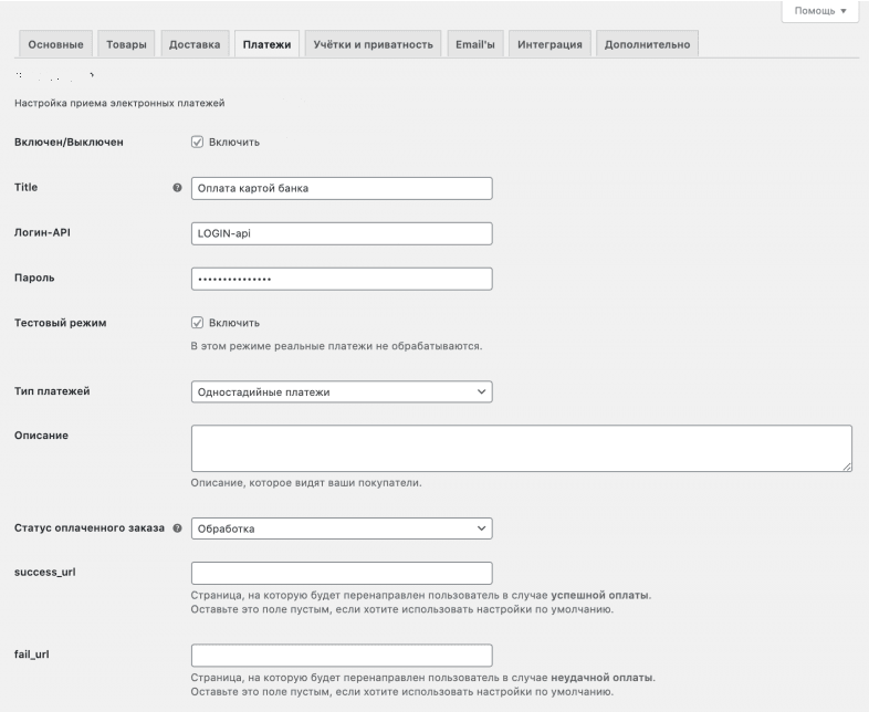 | Тестовый режим | Определяет, работает ли плагин в тестовом режиме (ДА) или в рабочем режиме (НЕТ).Обратите внимание, что логин и пароль для тестового и рабочего режимов могут отличаться. |