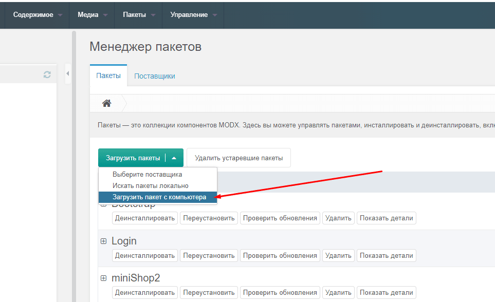 - В административной панели MODX перейдите в раздел Пакеты, нажмите Загрузить пакеты, выберите Загрузить пакет с компьютера, а затем выберите архив с плагином.