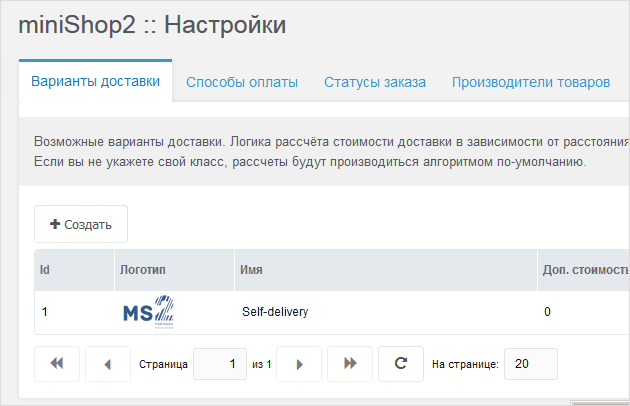- В административной панели MODX перейдите в Пакеты > miniShop2 > Настройки > Варианты доставки и нажмите Создать.