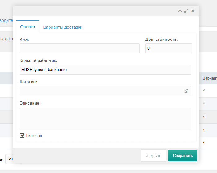Введитеrbspayment_<имя банка>в поле Класс-обработчик — здесь <имя банка> должно быть указано так же, как в названии архива (при необходимости уточните у службы технической поддержки). Обязательно установите флажок Включен, чтобы активировать способ оплаты. - Нажмите Сохранить.