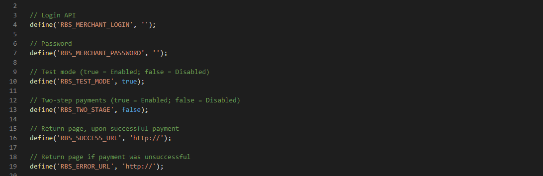 | RBS_TEST_MODE | Возможные значения: true или falseОпределяет, работает ли плагин в тестовом режиме ( true) или в рабочем режиме (false).Обратите внимание, что логин и пароль для тестового и рабочего режимов могут отличаться. |