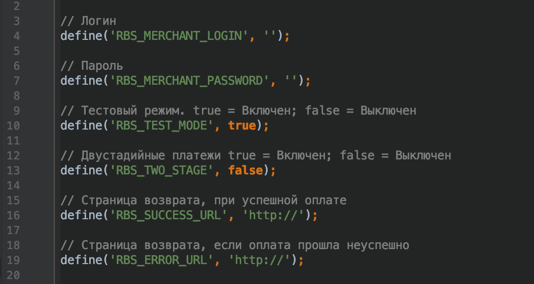 | RBS_TEST_MODE | Возможные значения: true или false.Определяет, работает ли плагин в тестовом режиме ( true) или в рабочем режиме (false).Обратите внимание, что логин и пароль для тестового и рабочего режимов могут отличаться. |