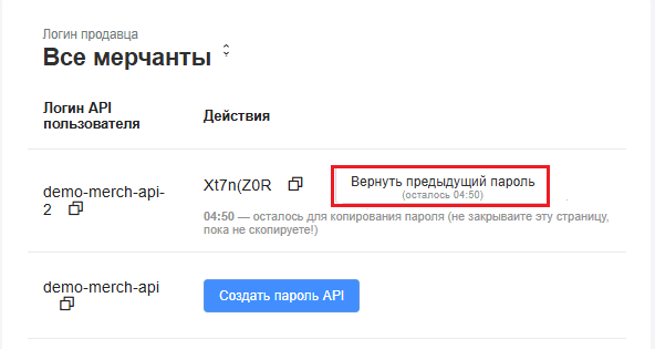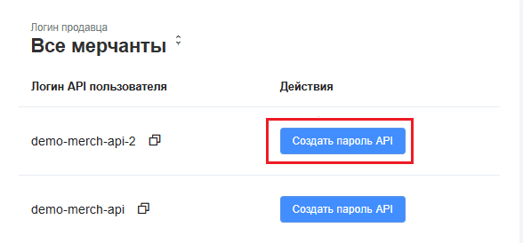 Создание пароля API. Для этого нажмите Создать пароль API.