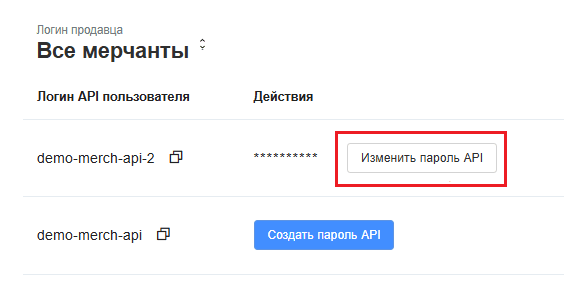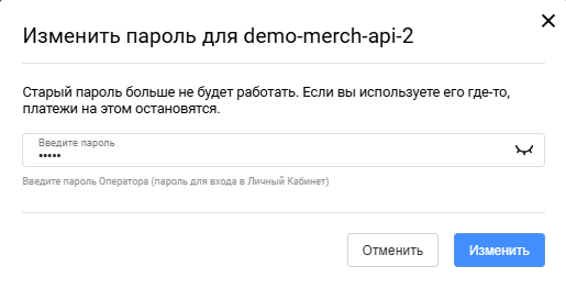 Изменение пароля API. Для этого нажмите Изменить пароль API и подтвердите действие в открывшемся окне: