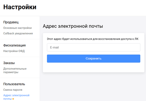 | Адрес электронной почты продавца, на который будут отправляться уведомления. В это поле можно ввести несколько адресов электронной почты (через запятую). Триггеры для отправки уведомлений настраиваются. Могут быть настроены на такие события, как изменение статуса транзакции, создание связки и т.д. | |
