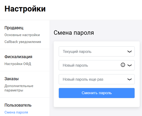 . - На отобразившейся странице выберите вкладку Смена пароля. Страница примет следующий вид.