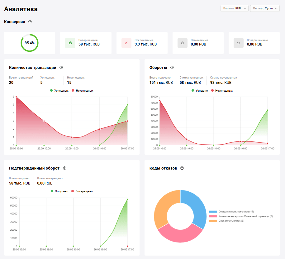 При двухстадийной оплате средства сначала замораживаются на счете клиента (статус заказа — Подтвержден) и только потом зачисляются на счет продавца (статус заказа — Завершен). Возможна настройка, чтобы окончательное перечисление происходило автоматически через определенное заданное в системе время, например, через 24 часа. Но эту операцию можно совершить вручную из личного кабинета продавца.
