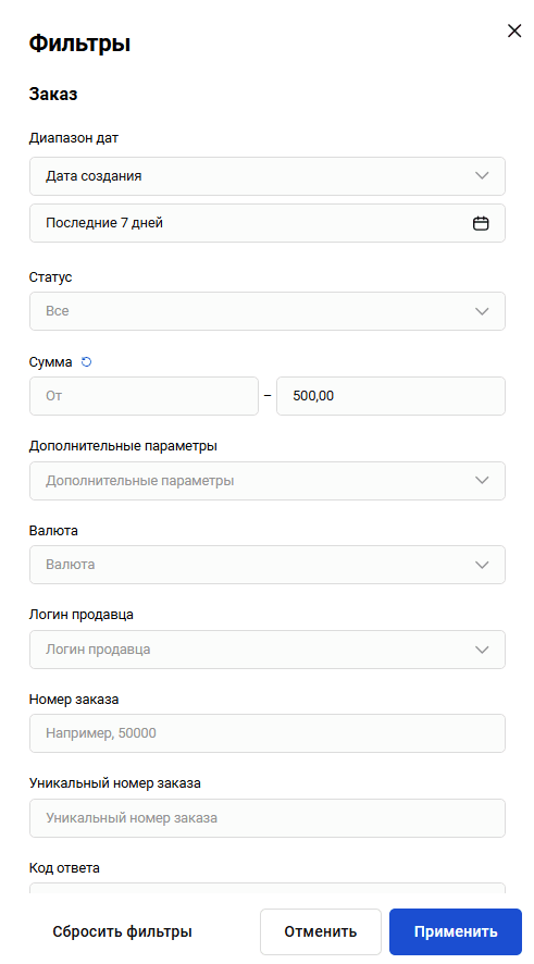Если у пользователя есть аффилированные продавцы, выбор продавца становится доступным в выпадающем меню Продавец.