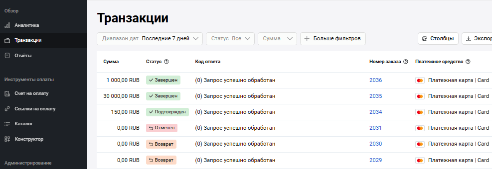 Из личного кабинета можно выполнить возврат средств по произведенным транзакциям (оплаченным клиентами заказам, которые находятся в статусе Завершен). Для двухстадийных платежей статус Завершен означает, что средства, находящиеся на карте плательщика, уже списаны.