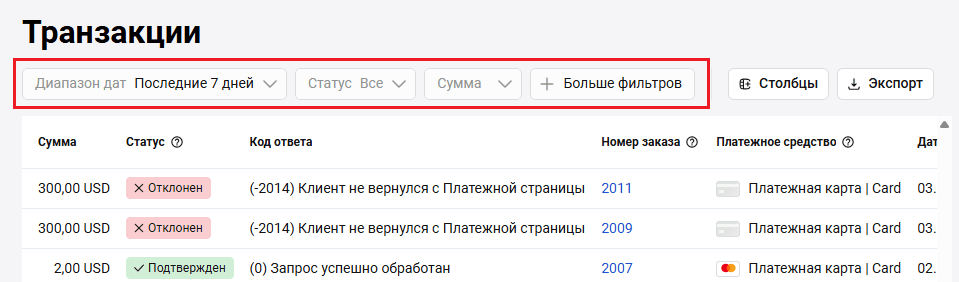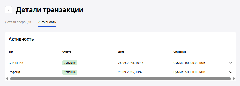 На вкладке Активность содержится информация обо всех событиях по заказу: зачислениях оплаты, возвратах и т.д.
