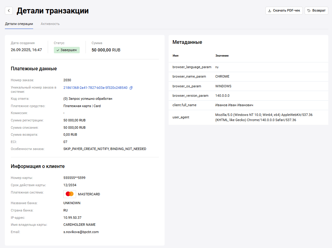| Возврат | Сведения о возврате средств. Отображается только если был возврат. |