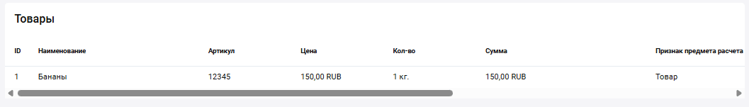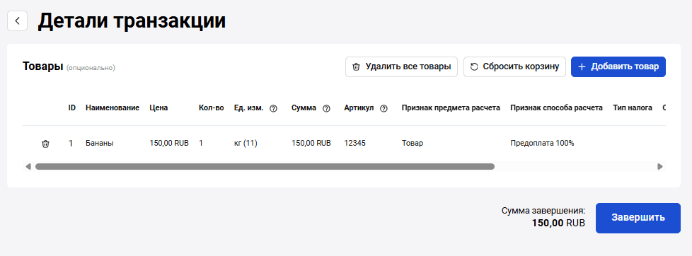 Для заказа, в котором была передана корзина товаров, отобразится таблица с корзиной заказа. Набор отображаемых параметров зависит от подключенной ОФД системы. При необходимости измените параметры корзины. Чтобы сбросить изменения в товарных позициях, нажмите Сбросить корзину.