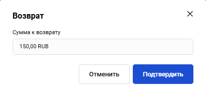 Проверьте сумму возврата. Вы можете вернуть всю сумму или указать меньшую сумму. Нажмите Подтвердить. Заказ перейдет в статус Возврат. Если на предыдущем шаге вы решили вернуть меньшую сумму, вы можете делать возвраты до тех пор, пока не будет возвращена вся сумма