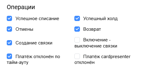 Выберите события, для которых будет отправляться уведомление обратного вызова. Уведомление будет отправлено как при успешном выполнении операции, так и в случае ошибки.