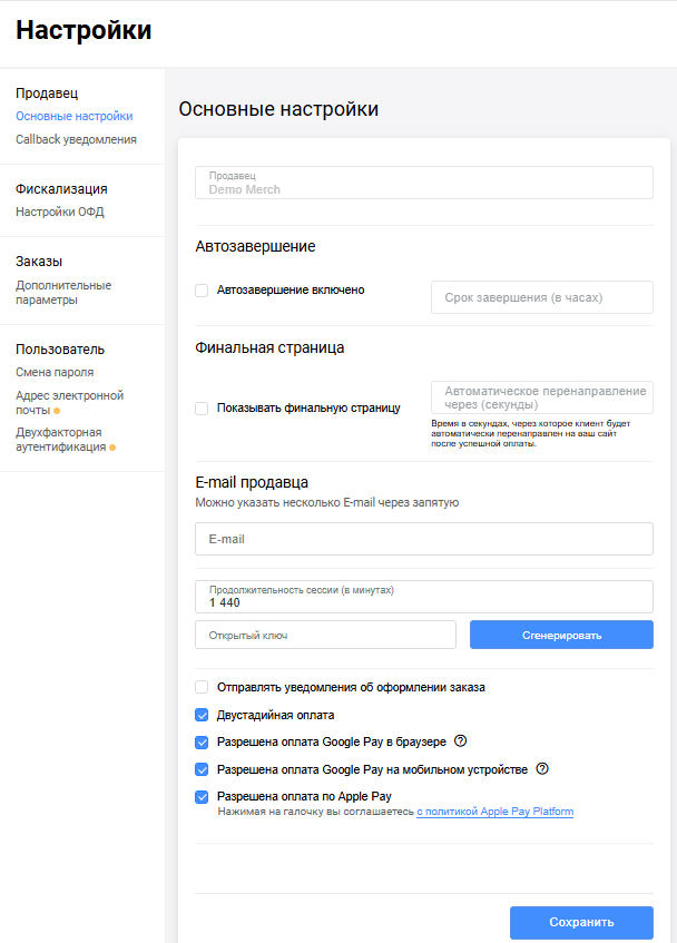 Чтобы перейти в раздел Основные настройки, выберите Настройки в боковом меню, а затем выберите Основные настройки в блоке Продавец. Отобразится страница настроек учетной записи, как показано ниже.