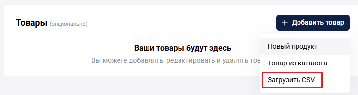 Вы можете зарегистрировать заказ с корзиной, и эта корзина может автоматически заполняться из файла CSV. Чтобы загрузить корзину автоматически, нажмите кнопку Добавить товар и выберите Загрузить CSV. В открывшемся окне выберите файл, который необходимо загрузить на ваше устройство.