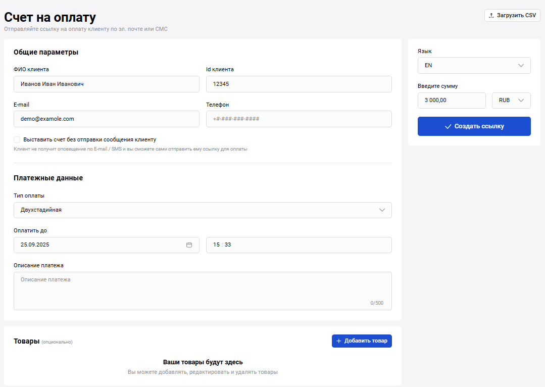 E-mail Адрес электронной почты, на который будет отправлена ссылка на оплату Тип оплаты Выберите один из двух вариантов. - Одностадийная — после совершение оплаты дополнительных действий с вашей стороны не требуется.