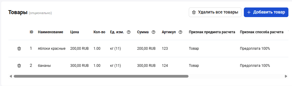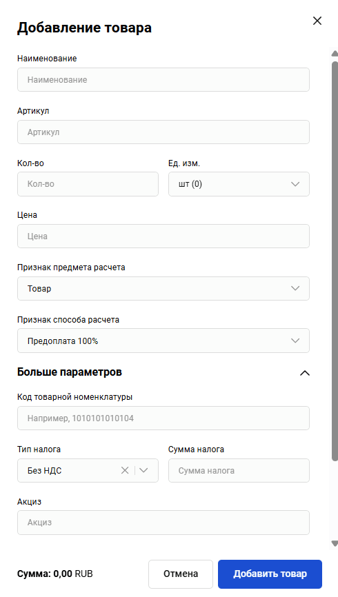 Поле Описание Наименование Наименование товара или услуги. Обязательное поле. Артикул Артикул товарной позиции. Обязательное поле. Кол-во Количество товара по данной товарной позиции. Обязательное поле. Ед. изм. Единицы измерения, например: л — литры, шт. — штуки. Обязательное поле. Цена Цена за единицу товарной позиции. Обязательное поле. Сумма Общая сумма за все единицы одной товарной позиции. Высчитывается автоматически при заполнении полей Цена и Кол-во. Если у вас настроена фискализация, заполните (опционально) следующие поля (набор значений может немного различаться в зависимости от версии ОФД):