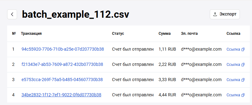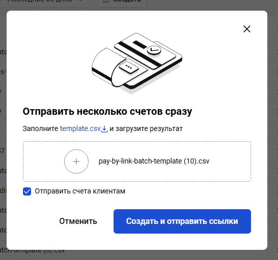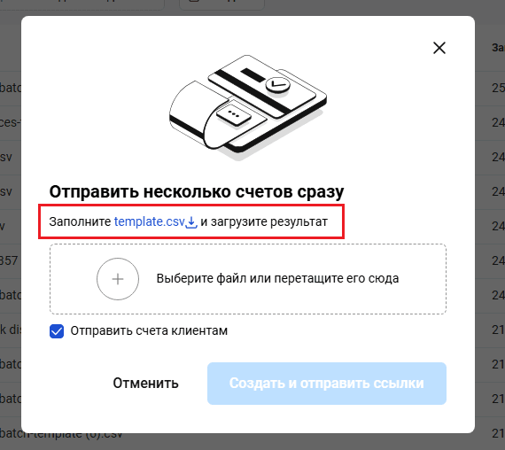 Если у вас есть соответствующее разрешение, вы можете отправить клиентам несколько счетов на оплату сразу, загрузив файл в формате CSV с данными счетов и адресами электронной почты. Формат файла определяется шаблоном, который настраивается командой поддержки.