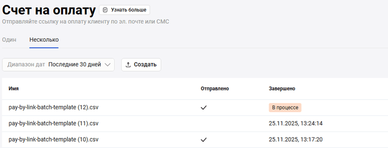 В списке обработанных файлов появится новая строка с загруженным файлом. Пока файл формируется, в колонке Завершено отображается статус "В процессе". Когда файл будет обработан, в этой колонке будет отображаться дата и время завершения обработки файла. В колонке Отправлено отображается галочка, если ссылки для оплаты были отправлены клиентам.