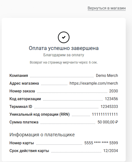 Можно настроить прием платежей так, чтобы после успешной оплаты клиент перенаправлялся на Финальную страницу. На этой странице находятся данные об оплате и ссылка обратно в магазин.