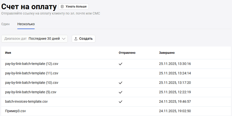 Перейдите в раздел Счет на оплату и откройте вкладку Несколько. Страница отображает список загруженных ранее файлов (если они есть).