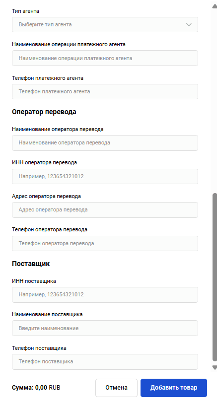 Наименование операции платежного агента Наименование операции платежного агента. Телефон платежного агента Номер телефона платежного агента. Наименование оператора перевода Наименование оператора перевода. ИНН оператора перевода ИНН оператора перевода. Введенный ИНН должен быть валидным и состоять из 10 или 12 цифр. Адрес оператора перевода Адрес оператора перевода. Телефон оператора перевода Номер телефона оператора перевода. ИНН поставщика ИНН поставщика. Введенный ИНН должен быть валидным и состоять из 10 или 12 цифр. Наименование поставщика Наименование поставщика. Телефон поставщика Номер телефона поставщика. Нажмите Добавить товар.