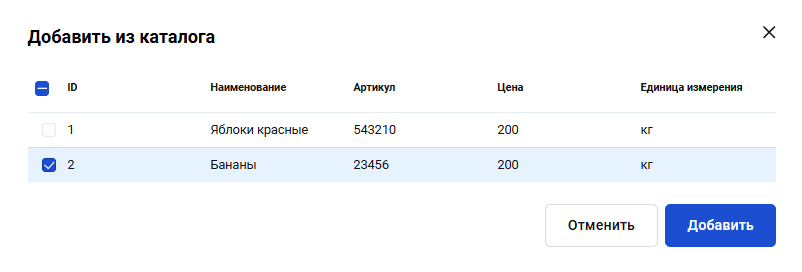 Вы можете добавить товары из каталога, для этого нажмите Добавить и выберите Товар из каталога, а затем выберите товар в открывшемся окне.